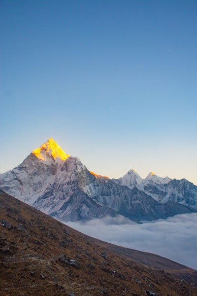 We’ll wake before dawn today to trek towards Kalapathar (which means “black rock”) for a fiery, glorious sunrise over Mt. Everest. The day’s first light will illuminate your spectacular view of Nuptse Nup, Changtse and Lhotse.This may be, of the whole journey, your most opportune moment to snap amazing pictures of Everest and its neighboring peaks. Afterwards, it’s back to Gorekshep for breakfast and a quick helicopter ride back to Lukla where we will get our flight back to Kathmandu. You’ll transfer to your hotel upon landing for some much-needed solo rest and reflection after your trek conquering the Himalayas. We’ll reunite in the evening for a farewell dinner at one of the best Nepalese restaurants in town, where we’ll be eager to hear your feedback on the trip.